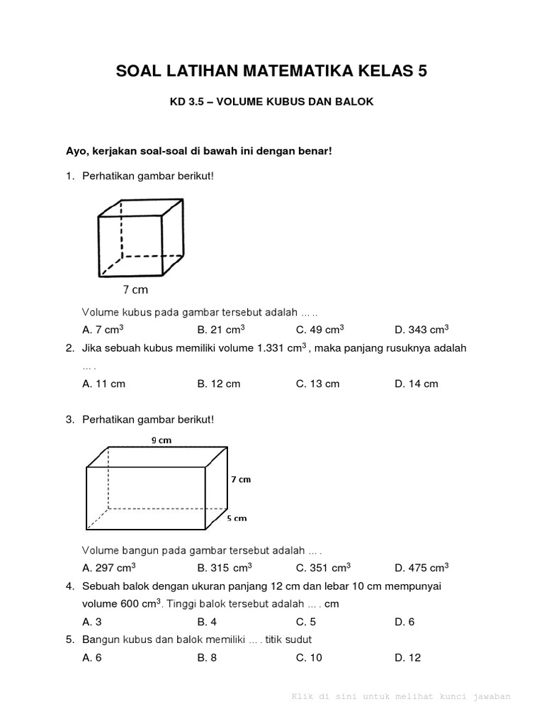 Soal Matematika Kelas 5 Kd Kd 3 5 Materi Pokok Volume Kubus Dan Balok Pdf