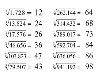 27 - 2 3 9. Jika sudah hafal maka mudah bagi adik-adik untuk mencari akar pangkat tiganya. 5³ 6³ 5 6³ 30³ 27000 2.